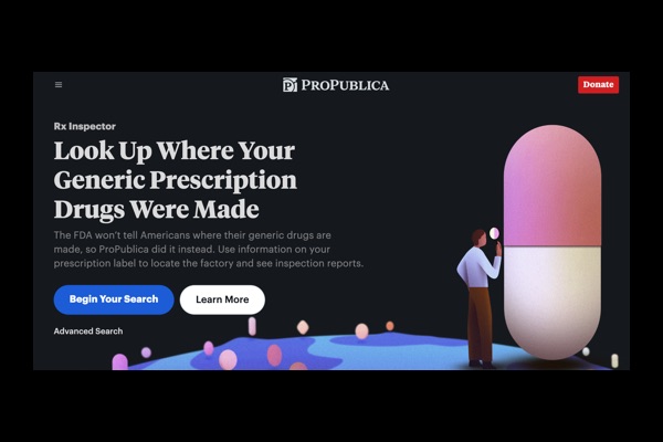 The Rx Inspector tool by ProPublica is a first-of-its-kind investigative database that allows users to trace generic prescription drugs back to the facilities where they were manufactured. Built from a large-scale investigative effort, the platform connects fragmented Food and Drug Administration (FDA) data to provide transparency into a system that has historically been difficult for the public to access.