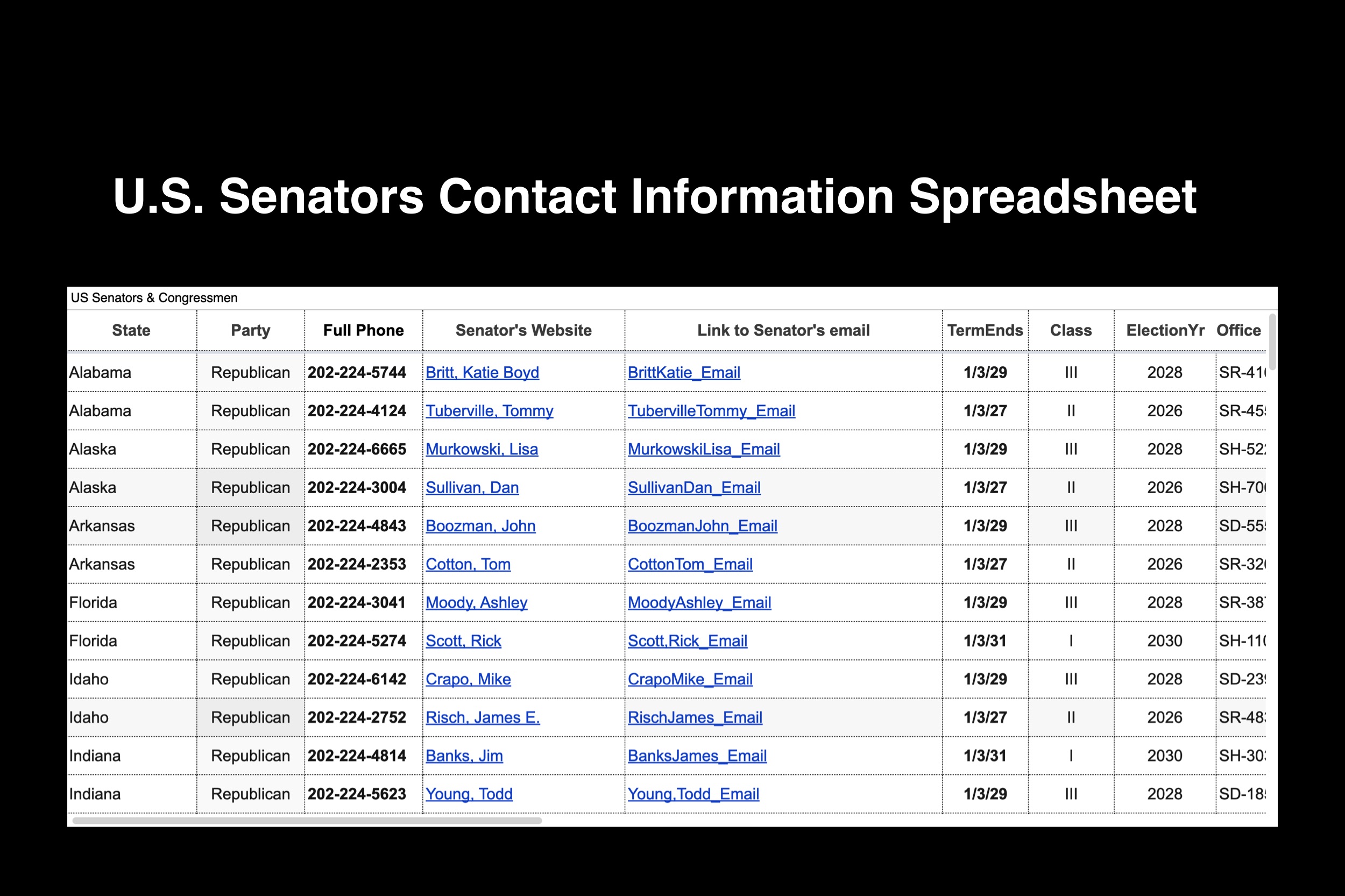 This publicly accessible spreadsheet compiles contact information for members of the United States Senate, including office phone numbers, staff contact addresses, and publicly available email or web contact portals. Instead of searching individual government websites one at a time, users can quickly locate how to contact any senator from a single organized directory.